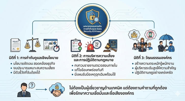 มิติแรก คือการกำกับดูแลเชิงนโยบาย กรรมการควรพิจารณาว่านโยบายด้านความปลอดภัยของข้อมูลและความเป็นส่วนตัวขององค์กรมีความชัดเจนแค่ไหน สอดคล้องกับทิศทางธุรกิจหรือไม่ งบประมาณที่จัดสรรให้เหมาะสมกับระดับความเสี่ยงที่แท้จริงหรือเปล่า ยกตัวอย่างเช่น บริษัทที่เก็บข้อมูลบัตรเครดิตลูกค้าหลายแสนราย ย่อมต้องลงทุนด้านระบบรักษาความปลอดภัยมากกว่าบริษัทที่ไม่ได้เก็บข้อมูลอ่อนไหวประเภทนี้ นอกจากนี้ องค์กรควรมีตัวชี้วัดที่จับต้องได้ เช่น เมื่อเกิดเหตุข้อมูลรั่วไหล ทีมงานสามารถตอบสนองได้ภายในกี่ชั่วโมง หรือในรอบปีที่ผ่านมามีเหตุการณ์ที่ข้อมูลส่วนบุคคลถูกเข้าถึงโดยไม่ได้รับอนุญาตกี่ครั้ง